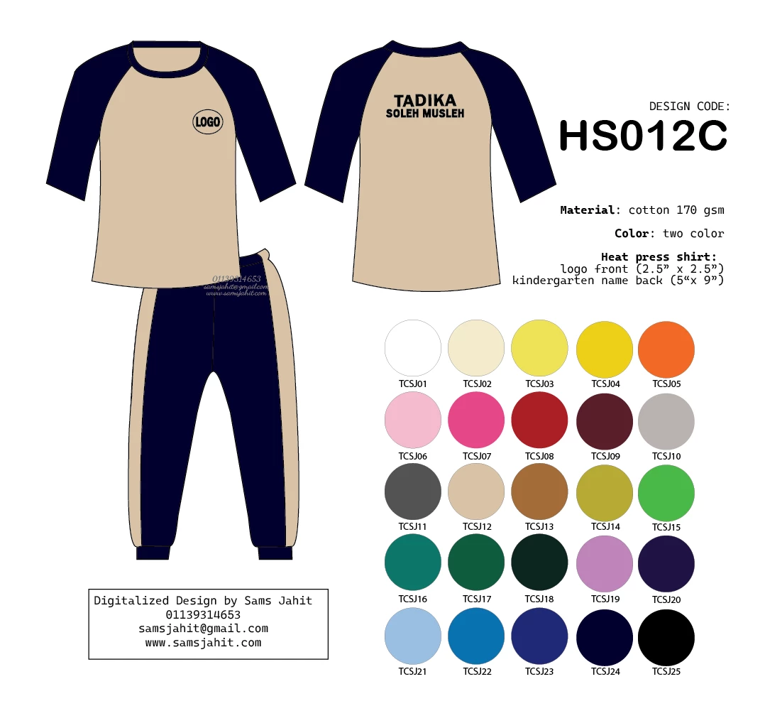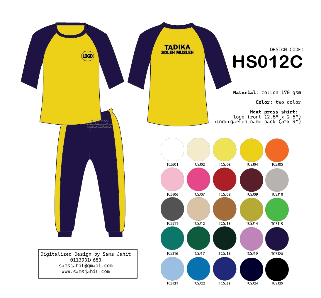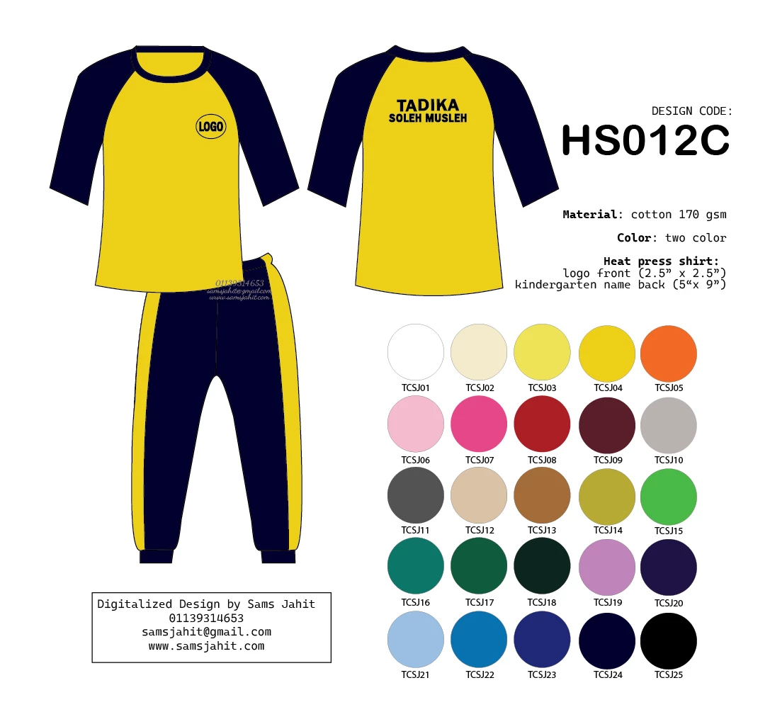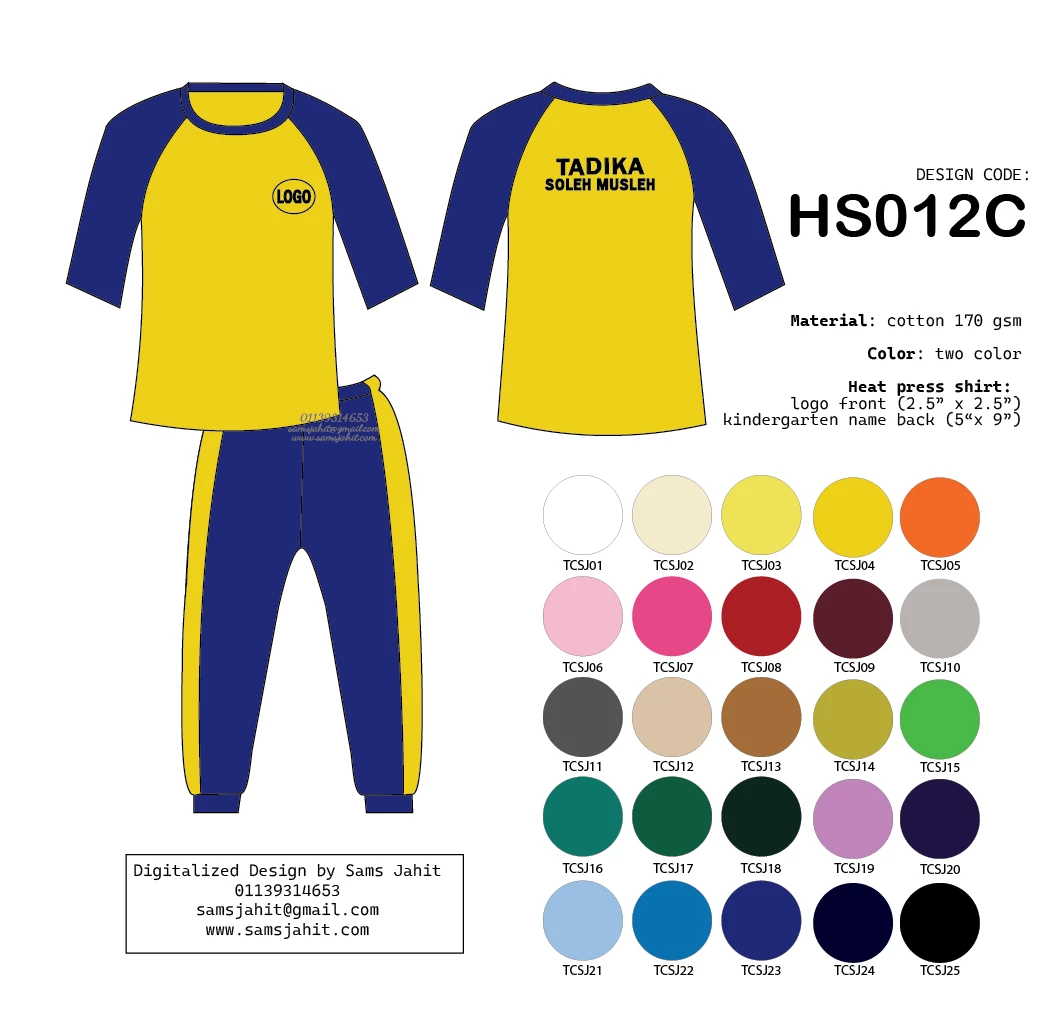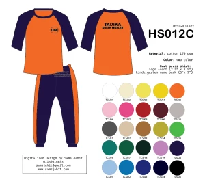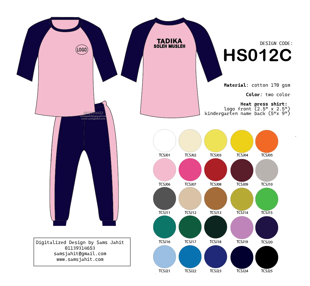 Harga untuk Moq 50 pcs, sudah termasuk heat press logo depan dan nama tadika dibelakang baju. (Tidak termasuk poket seluar dan heat press seluar)