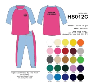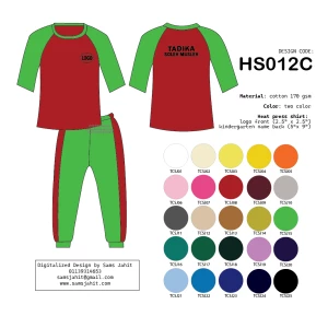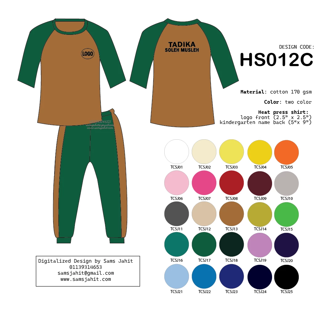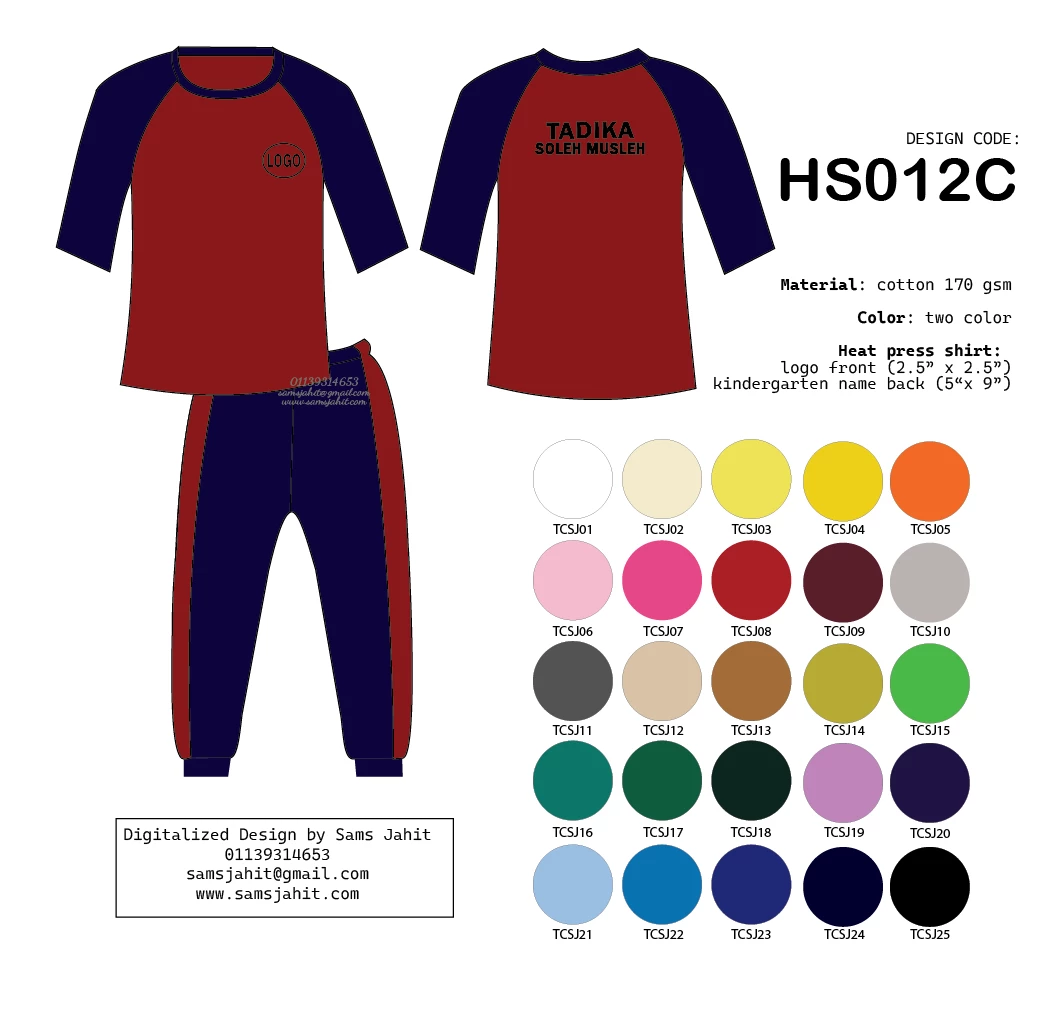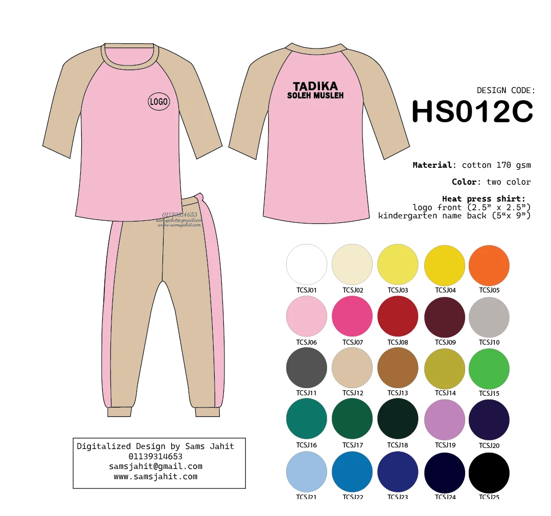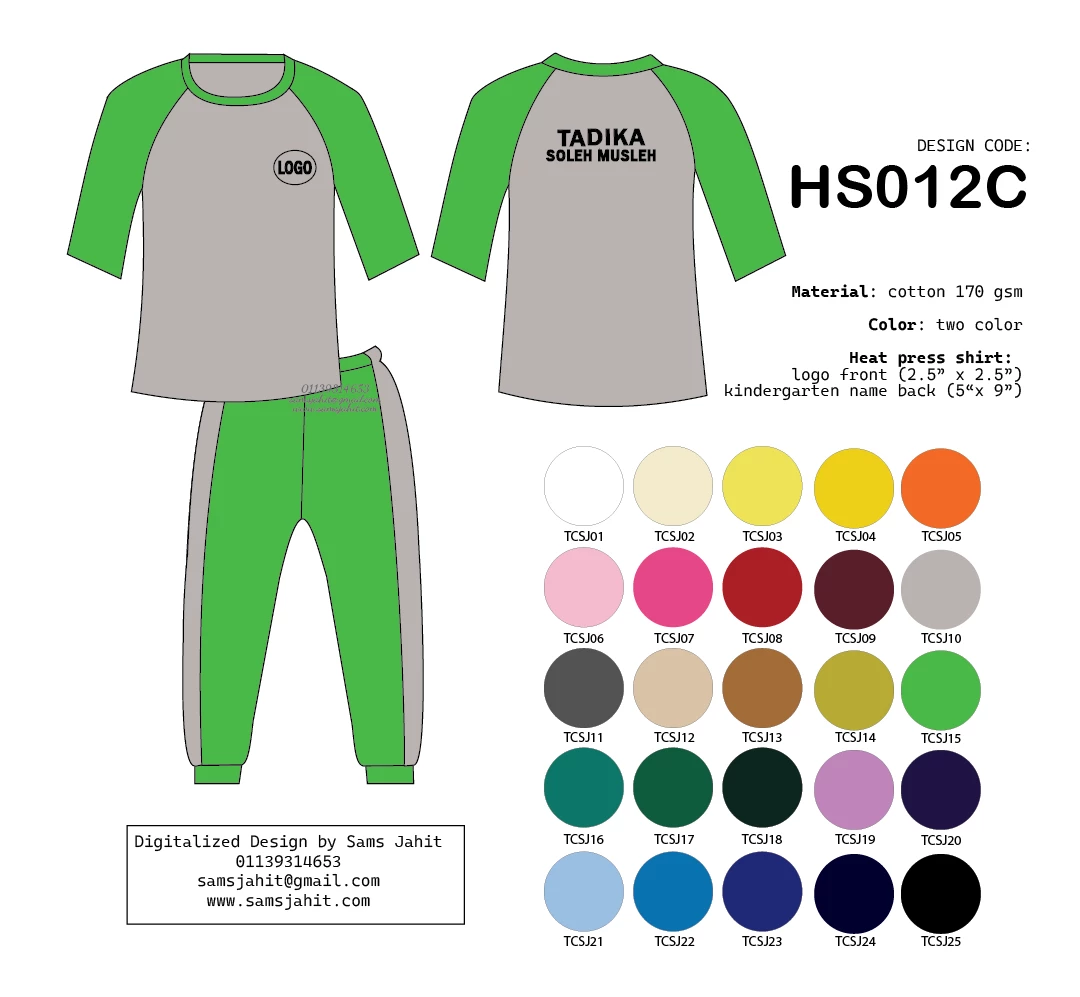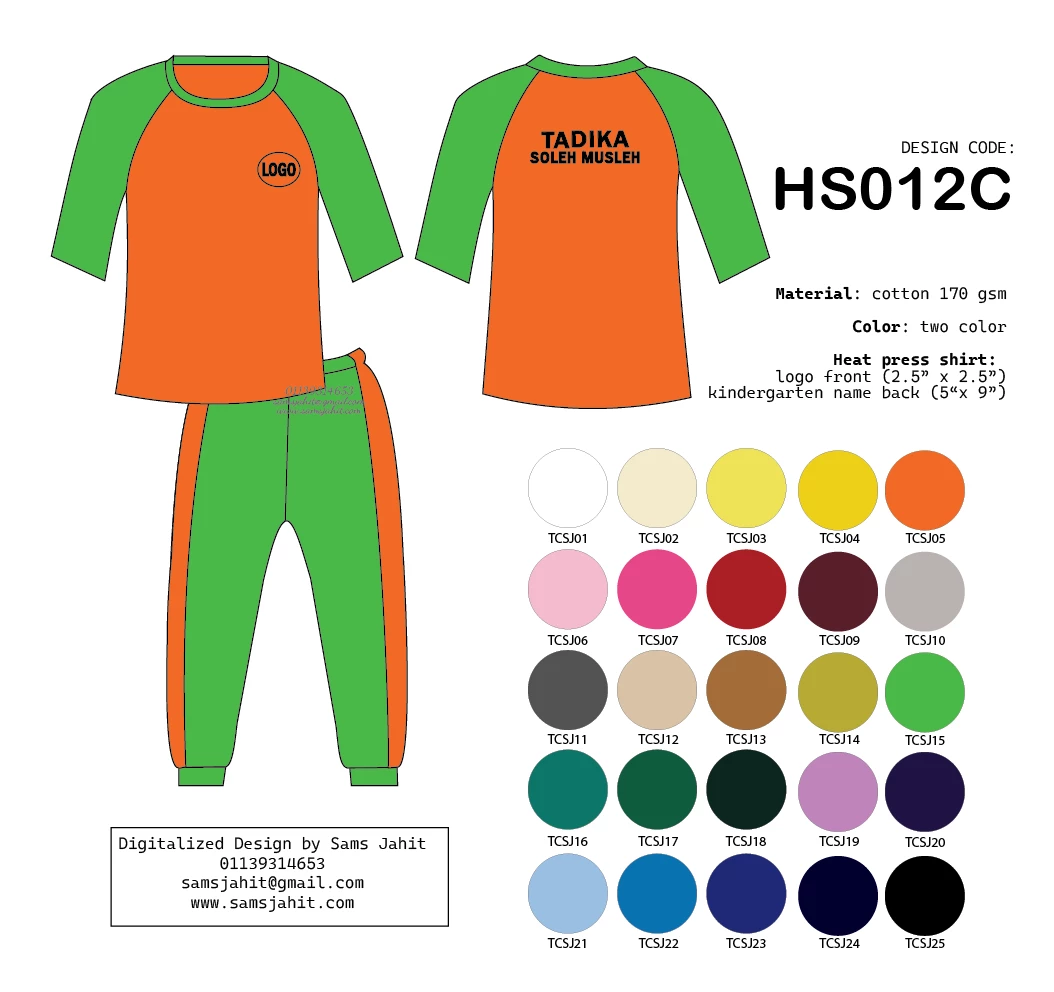 Harga untuk Moq 50 pcs, sudah termasuk heat press logo depan dan nama tadika dibelakang baju. (Tidak termasuk poket seluar dan heat press seluar)